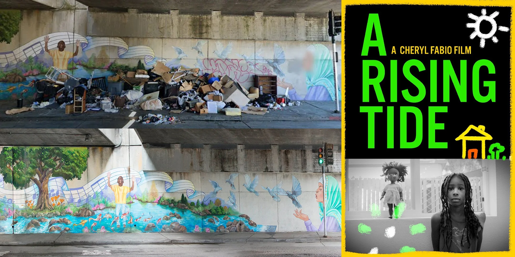 In the past five years, and more dramatically from the onset of the pandemic, Oakland’s murals have been devastated by the symptoms of structural, political, and social dysfunction–made especially visible with the destruction of OSH murals #2 and #3 from tagging, dumping, and fires. The murals also serve as a backdrop for residents facing homelessness in the Market Street and West Street highway underpasses. With this screening, ArtEsteem hopes to garner community resources to support the restoration of the murals and assist the underpass residents. A part of this effort includes informing our community on the intricacies of the housing crisis through A Rising Tide.