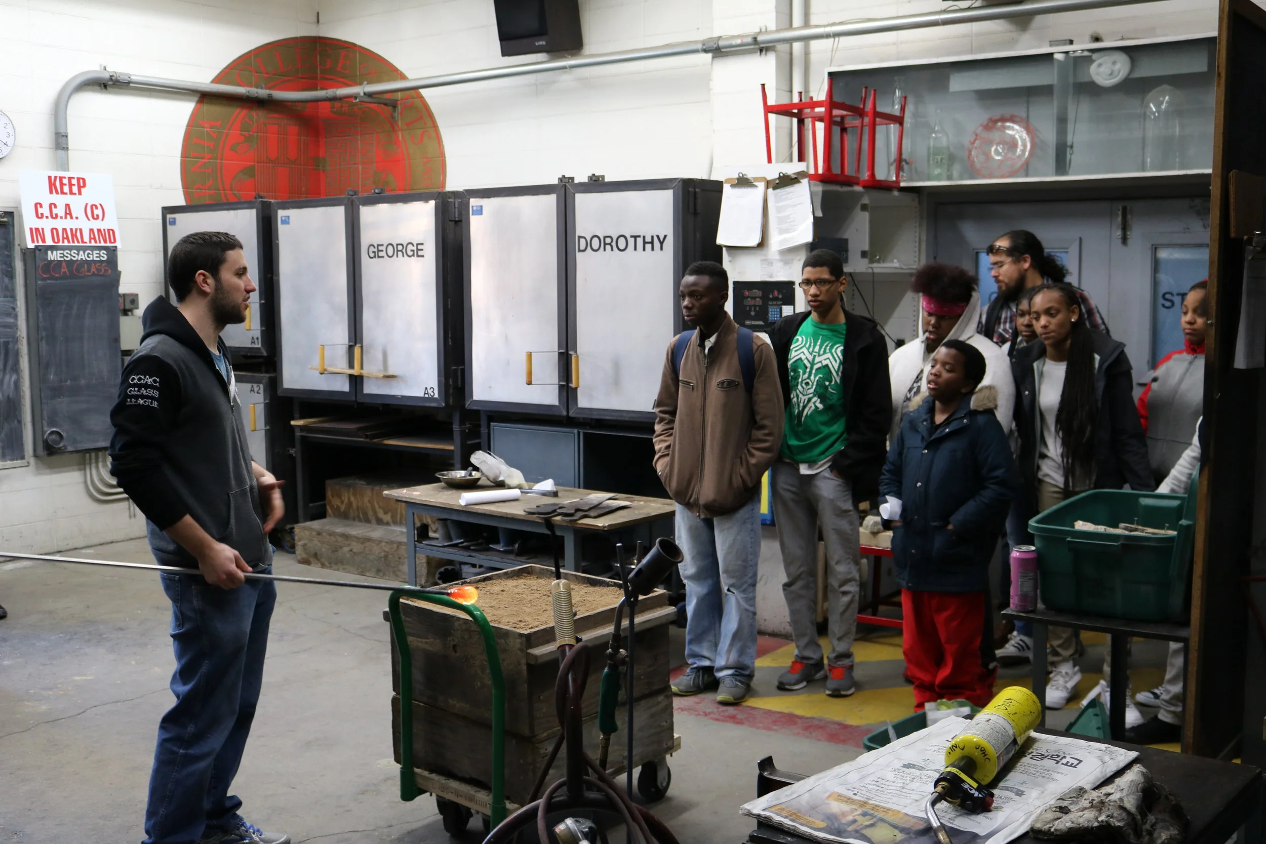 Emerging slowly and rotating slightly, the black iron bar exited the orange glow coming from the mouth of the furnace. Punctuated by a lemon sized orange jewel of molten glass, Brett ( 22 year old glass student at CCA, and student intern at AHC from Amana Harris’ AIPI class) skillfully manipulated the iron bar out from the 2,000 degree furnace, and with great care swung it around and brought it close to a large sand box in the middle of the room. If dropped accidentally, the glass could dissipate its heat safely in the sand. Standing behind the large red safety line painted on the ground, the class of the WOLLP watched quietly and intently as other glass students from CCA watched with a certain satisfaction observing the faces of others less fortunate to be so well acquainted with the process. Brett explained the challenges and joys of working with glass, especially the need to kiln some pieces for weeks on end to gradually reduce the temperature of the glass and ensure it does not explode. This was just one of the first stops that the WOLLP class made on their recent field trip to the CCA campus.