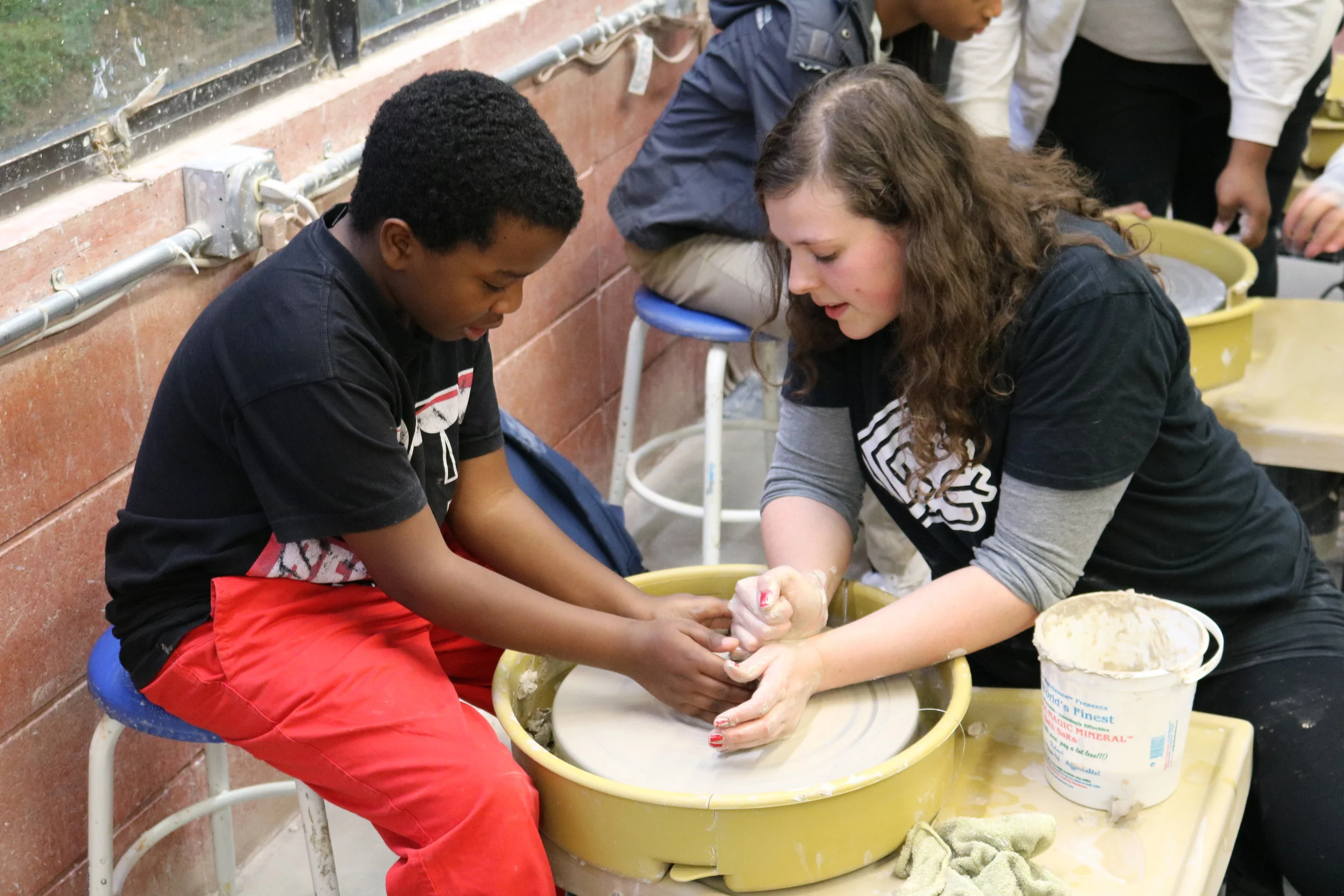 In the far corner of the studio, 10 professional electric pottery wheels were lined up and the students of WOLLP were treated to a demonstration by Yao, an upperclassman thrower who was fabled to be able to throw backward, facing away from the wheel, with his hands behind his back, although the group was unable to see such a feat on this visit. He demonstrated the delicate control and subtle strength needed to first center a block of clay, literally thrown at the center of the wheel when starting a new piece, and then to guide it up into the elegant curves of a vase, bowl or cup. Later the WOLLP students were able to get their hands dirty, and try to coax a recognizable form from their own shapeless mound of potential.
