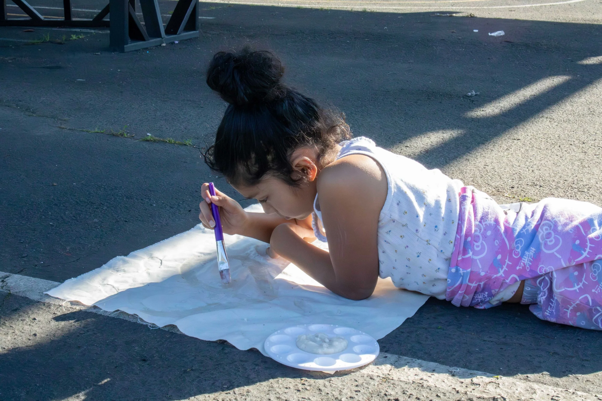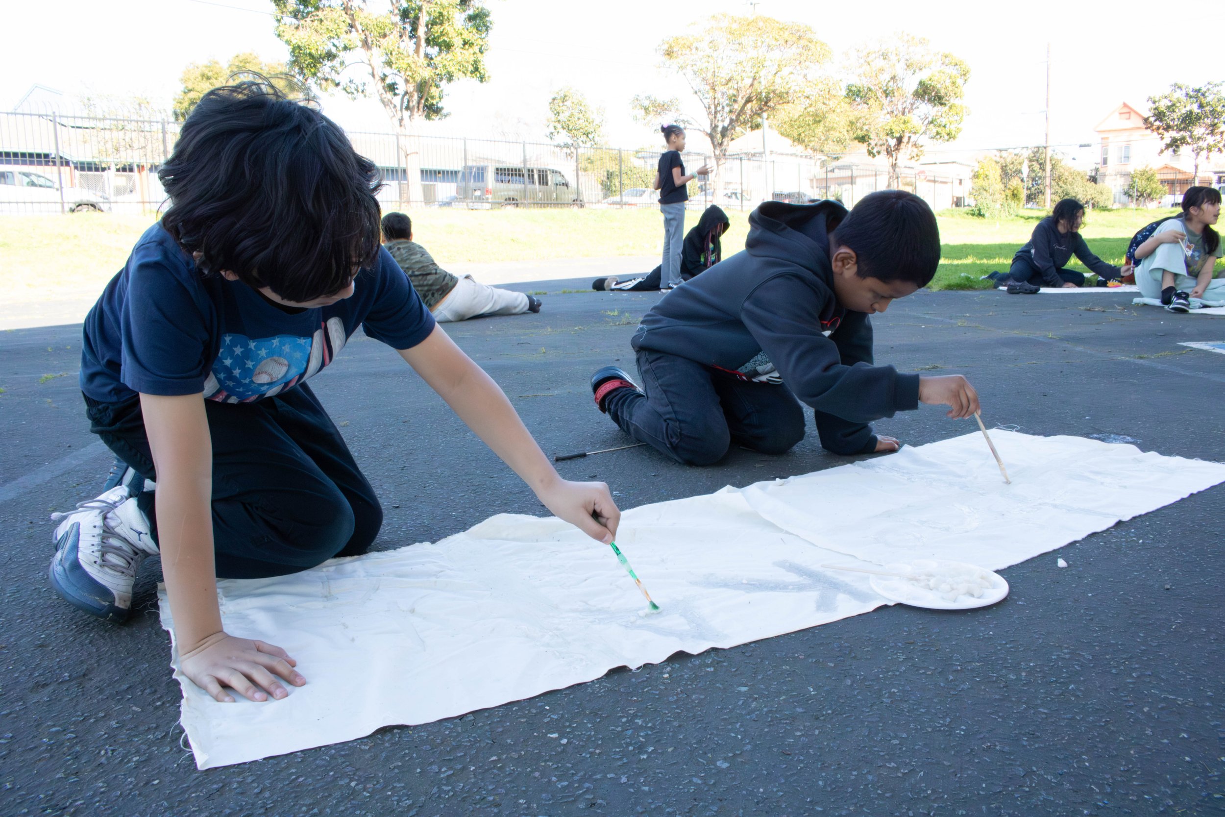 It’s easy to see Alexa’s vision in progress. During our classroom visit in early February, the students scattered across the pavement, warmed by the California sun, spreading the cassava flour paste onto muslin in various shapes and letters. There’s a levity and peace to the space.